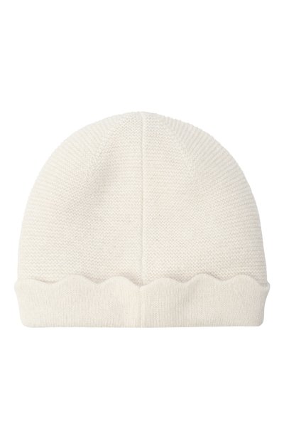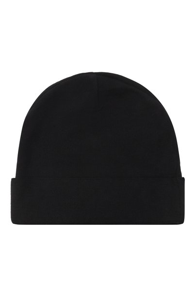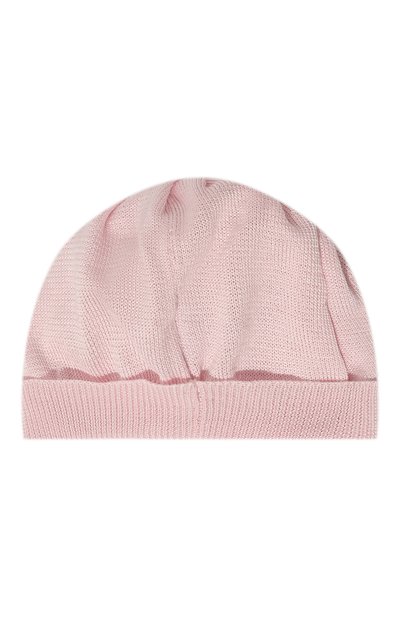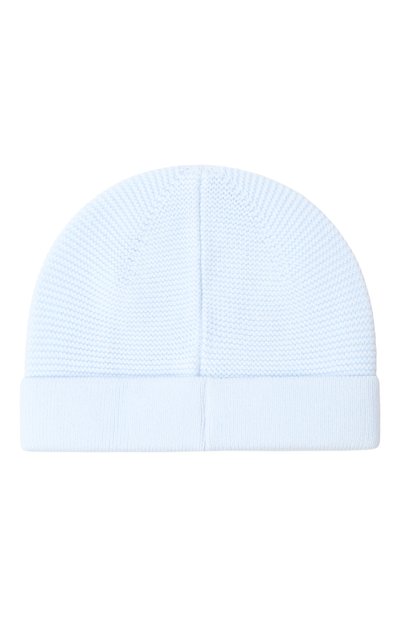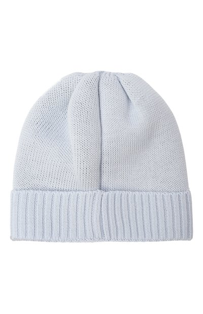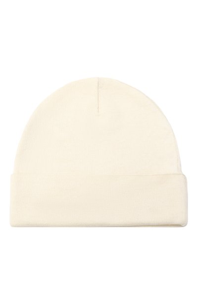 Для пошива эластичной шапки-бини использовали гладкий хлопковый трикотаж. Головной убор с узким отворотом украсили вышитым бантом и эмблемой марки.