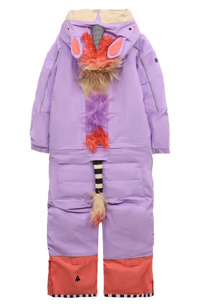 Короткий комбинезон из вискозного бархата дополнили контрастными текстильными рукавами и вставкой на лифе. Украшенная фирменной фурнитурой модель с бантом на талии застегивается потайной молнией сзади.