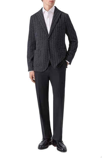 Однобортный пиджак в мелкую клетку «пье-де-пуль» выполнили из эластичной ткани на основе полиэстера и вискозы. Модель с двумя шлицами дополнили боковыми карманами с клапанами.