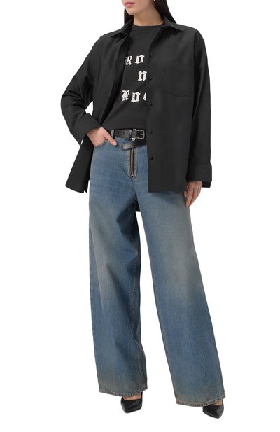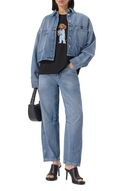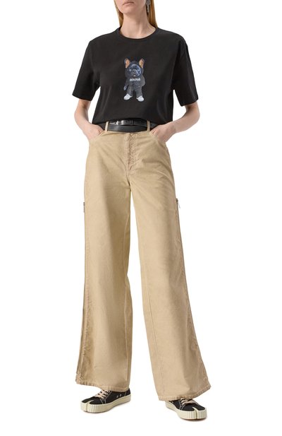 Футболку свободного кроя выполнили из хлопкового трикотажа, усиленного полиэстером. Спереди модель с круглым вырезом декорировали логотипом и фотопринтом в виде пуделя.