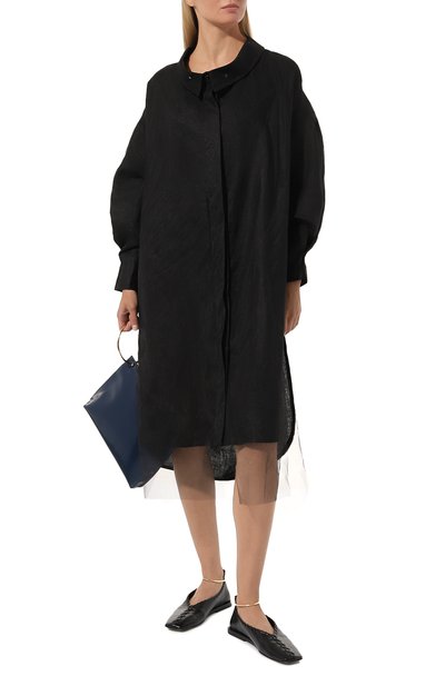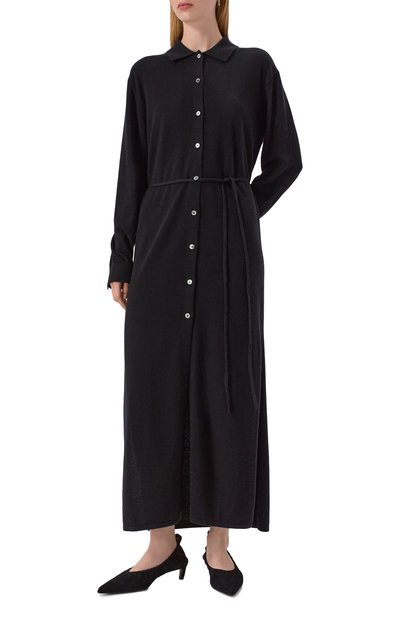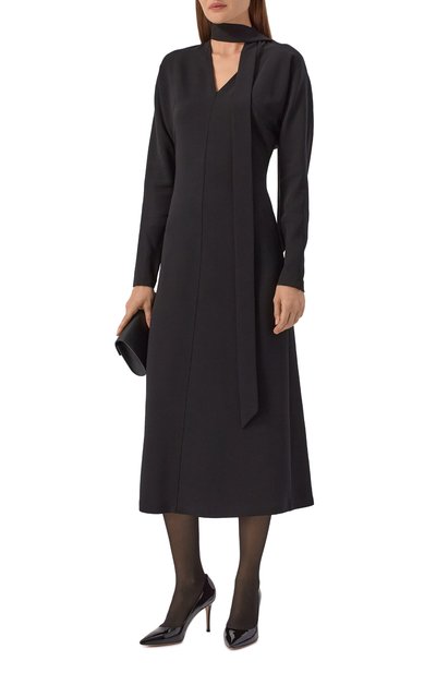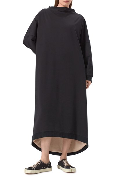 Платье Fagliatelle с высокими разрезами по бокам сшили из полушерстяного трикотажа. Рукава реглан украсили перфорированными узорами. Эластичную модель с высоким воротником, манжетами и отделкой в рубчик дополнили сзади брендированной подвеской.