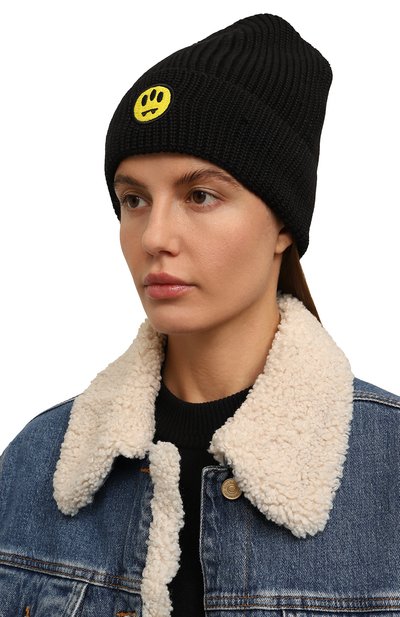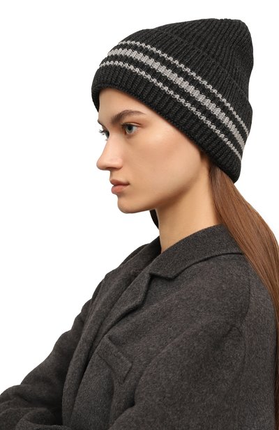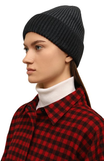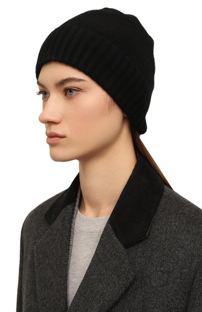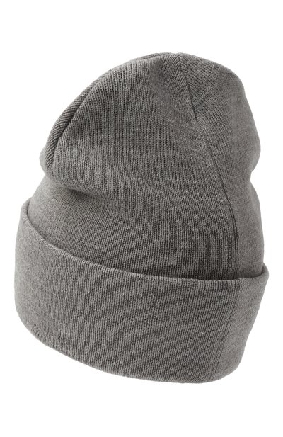 Шапку бини связали гладью из шерстяной пряжи с добавлением кашемира. Широкий отворот в рубчик украсили брендированной металлической накладкой.