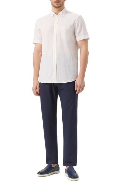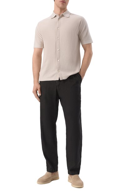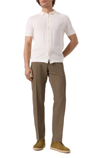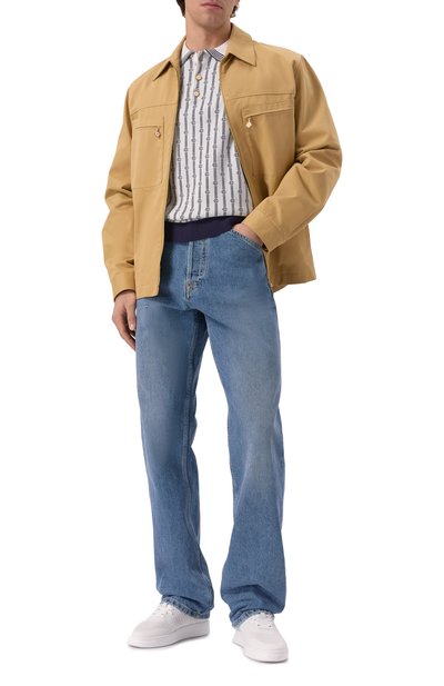 Рубашку C-Iconico с однотонной отделкой связали фактурным узором из хлопковой пряжи в цветах фирменного триколора. Модель с кубинским воротником застегивается пуговицами.