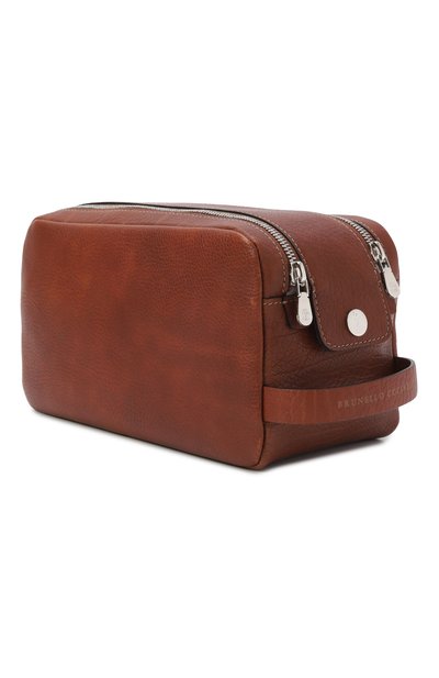Несессер из мелкозернистой телячьей кожи украсили тисненым логотипом бренда. Аксессуар на молнии дополнили подкладом из влагоотталкивающего текстиля и внутренней адресной биркой.