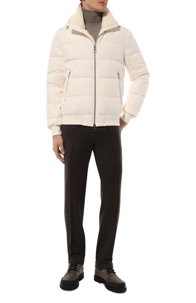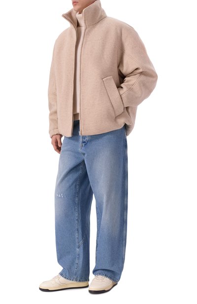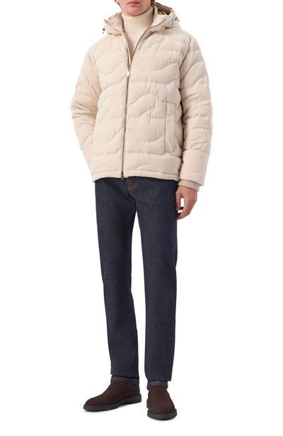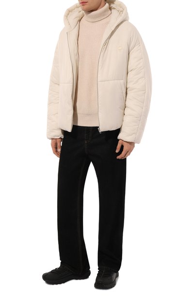 Стеганый пуховик с капюшоном и спущенной линией плеч дополнили боковыми карманами. Утепленная oversize-куртка из нейлона застегивается молнией.