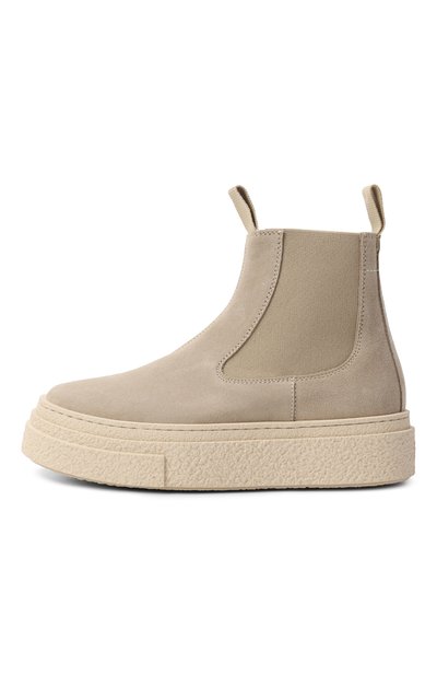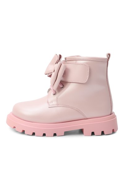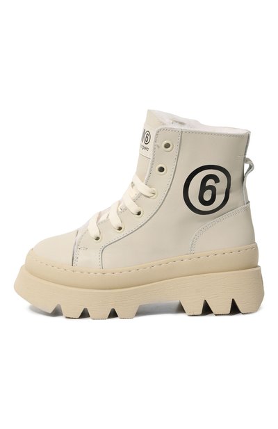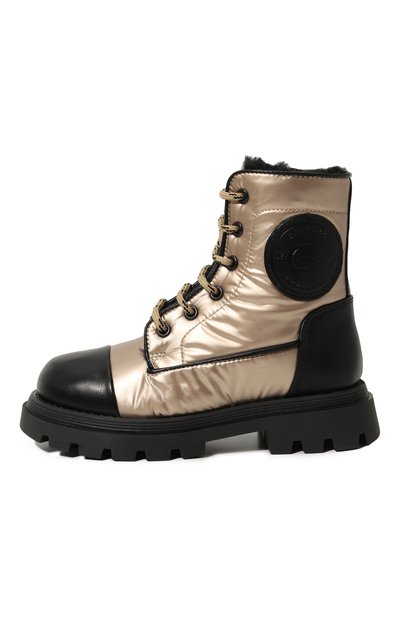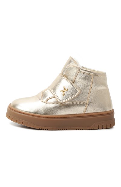 Ботинки с подкладом из овчины сшили из металлизированной кожи. Модель с протекторной подошвой застегивается ремешком-велкро с золотистой эмблемой марки.