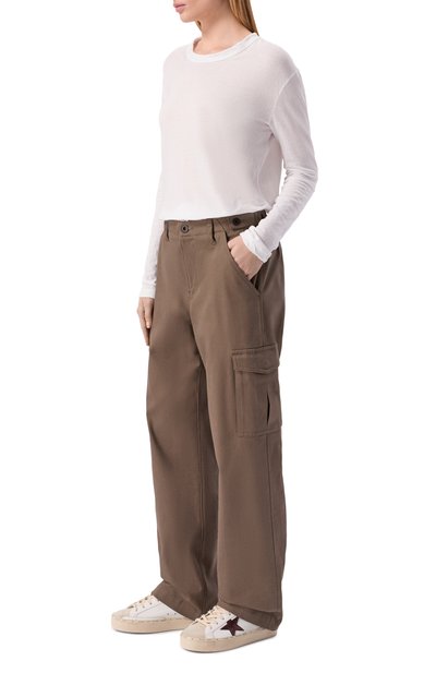 Брюки с широкими отворотами сшили из вельвета стрейч на основе хлопка и модала. Модель с защипами и стрелками дополнили четырьмя карманами.