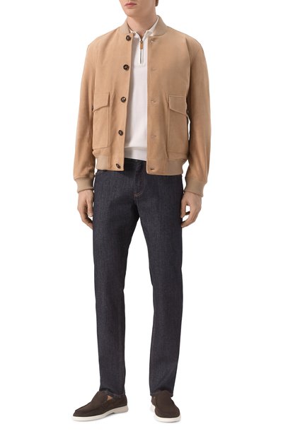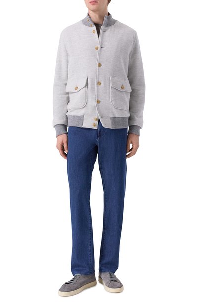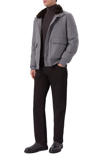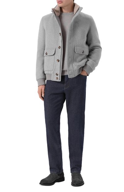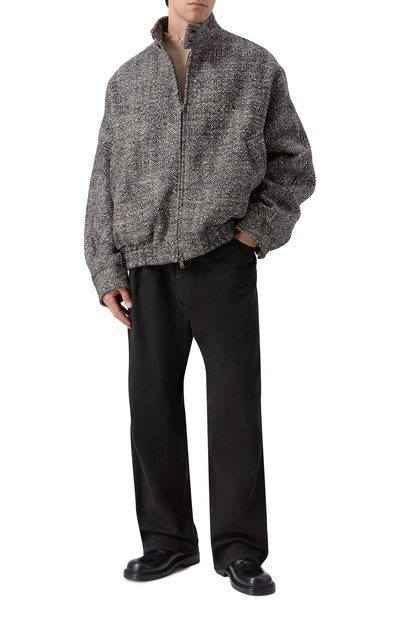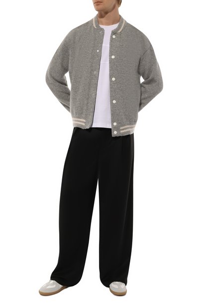 Бомбер с манжетами и поясом из трикотажа в рубчик сшили из фактурной полушерстяной ткани. Куртку с двумя накладными карманами дополнили съемным внутренним воротником из материала, напоминающего мех. Модель с фирменным патчем сзади застегивается молнией и брендированными пуговицами.