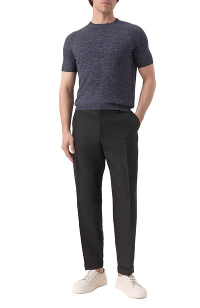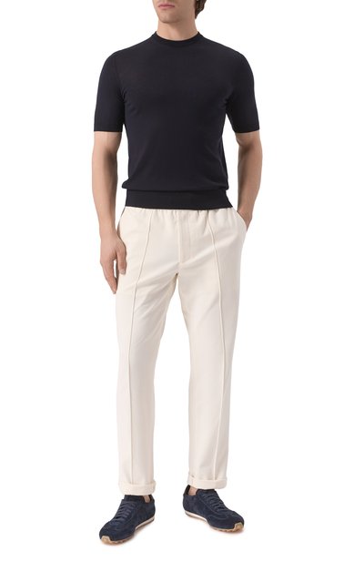 Джемпер с короткими рукавами сможет заменить базовую футболку в прохладную погоду. Модель с манжетами, поясом и горловиной в рубчик выполнили из тонкой шерсти с добавлением шелка.