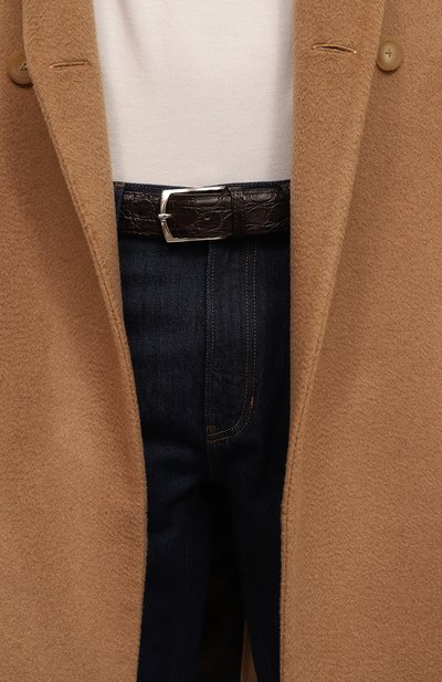 Ремень с двумя тренчиками изготовили из крупнозернистой кожи. Аксессуар застегивается металлической пряжкой с фирменной гравировкой.