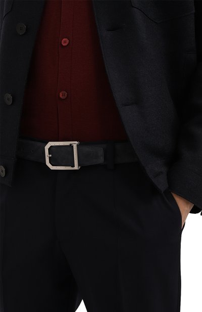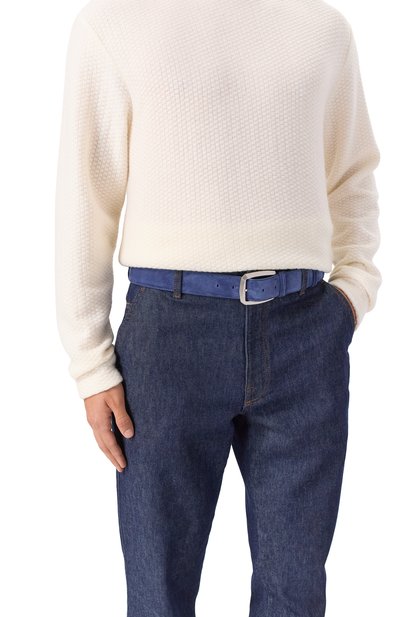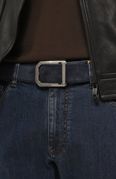 Ремень с геометричной металлической пряжкой поддержит повседневные образы с джинсами или чиносами. Для изготовления аксессуара с двумя шлевками использовали замшу.