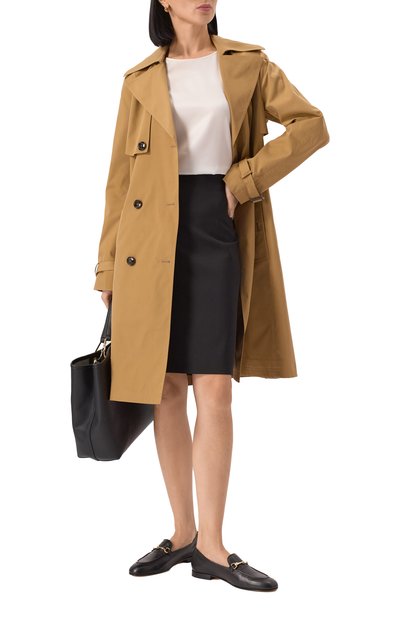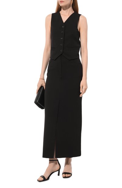 Миди-юбку прямого кроя выполнили из стрейчевой полушерстяной ткани. Модель с потайной застежкой и высокими разрезами спереди и сзади дополнили двумя молниями с длинными репсовыми лентами на пуллерах.