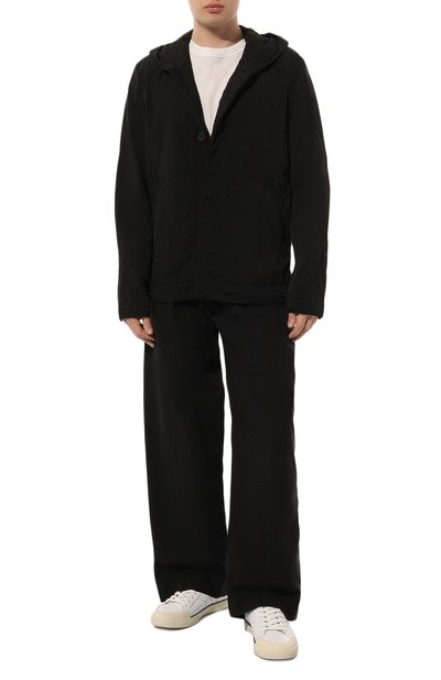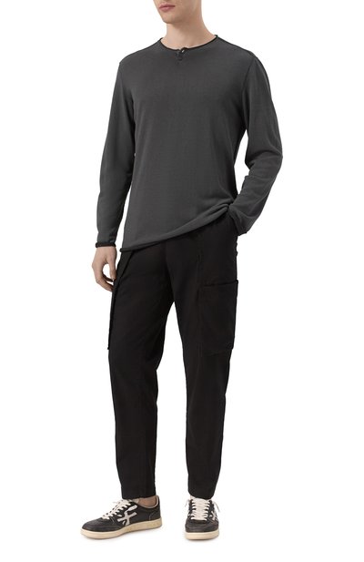 Полосатые брюки выполнили из хлопка с добавлением шерсти, вискозы и нейлона. Модель со шлевками для ремня дополнили четырьмя карманами.