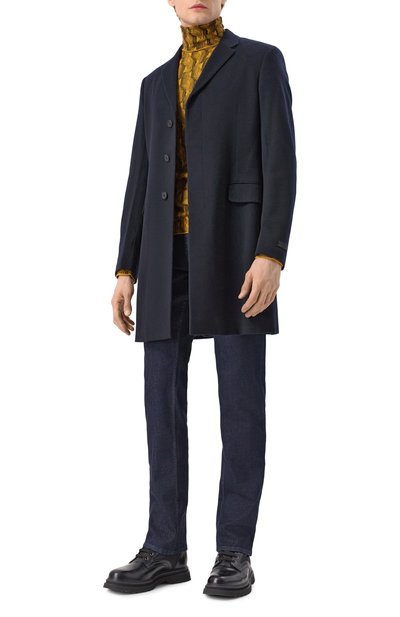 Широкие расклешенные джинсы, прошитые строчкой табачного оттенка, выполнили из неэластичного денима. На поясе сзади модель с двумя парами карманов декорировали патчем с логотипом марки.