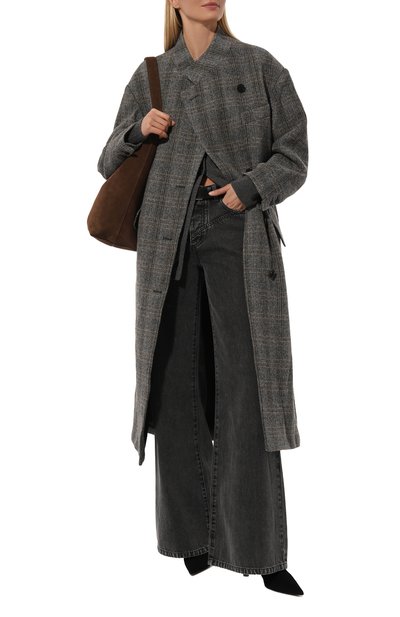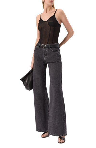 Для пошива широких джинсов с V-образным поясом использовали деним из органического хлопка, выращенного методом регенеративного земледелия. Модель с пятью карманами украсили искусственными заломами и небольшими потертостями.