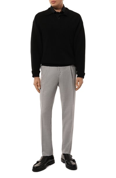 Для изготовления поло прямого кроя использовали шерстяной трикотаж с добавлением кашемира. Модель с манжетами и поясом в рубчик застегивается парой пуговиц.