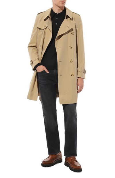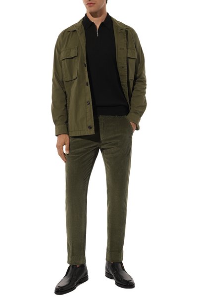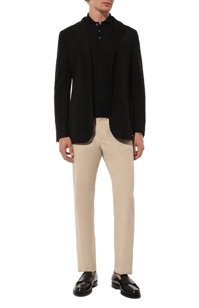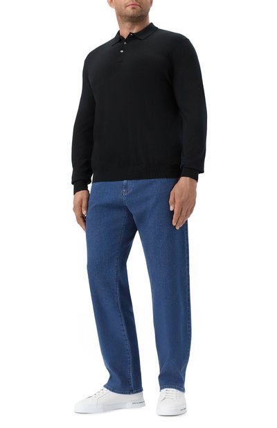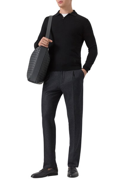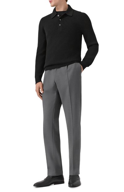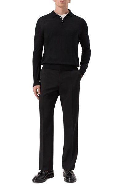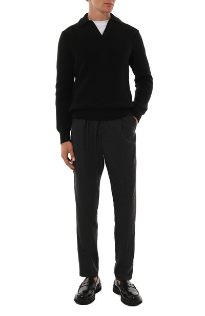 Для изготовления поло прямого кроя использовали шерстяной трикотаж с добавлением кашемира. Модель с манжетами и поясом в рубчик застегивается парой пуговиц.