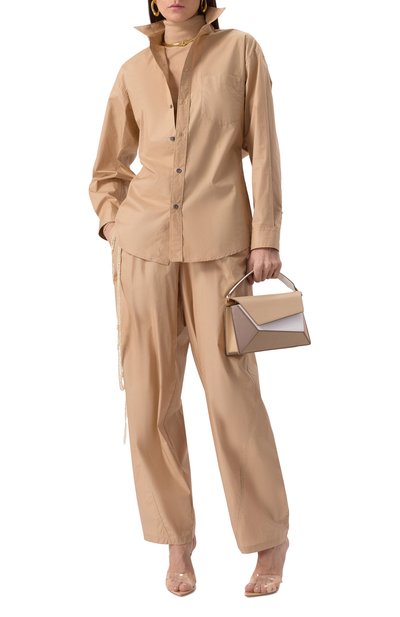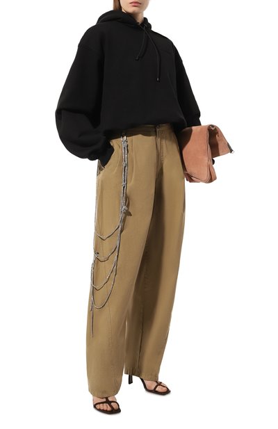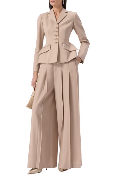 Расклешенные брюки со стрелками сшили из легкой шерсти. Модель со средней посадкой и четырьмя врезными карманами дополнили контрастным поясом-резинкой с логотипами марки.