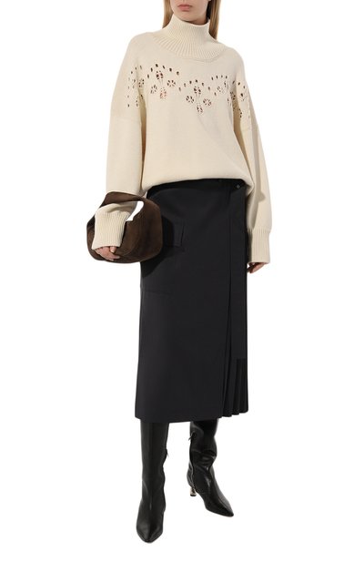 Свитер связали арановым узором из шерстяной пряжи. Спереди и на манжетах модель украсили контрастными лентами и бархатистыми бантами.