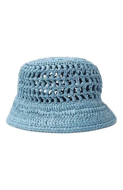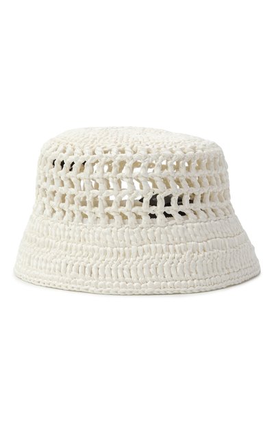 Для изготовления ажурной панамы с уплотненными покатыми полями использовали напоминающую рафию вискозу. Тулью модели украсили логотипом марки, вышитым контрастной нитью.