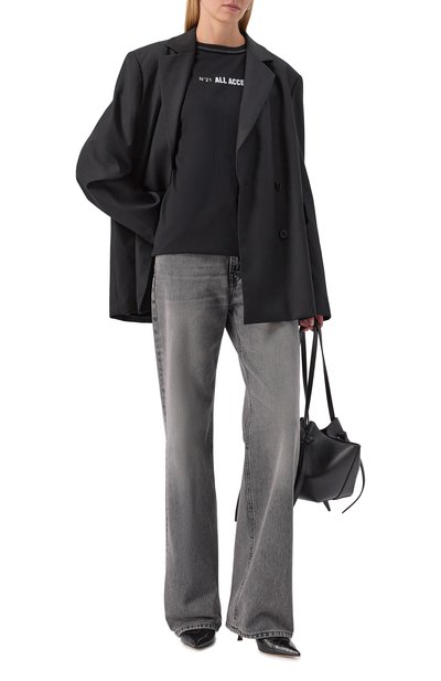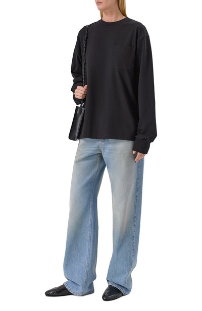 Лонгслив с круглой горловиной в рубчик сшили из эластичного хлопкового джерси. Спереди приталенную модель украсили репсовой лентой с логотипом марки.