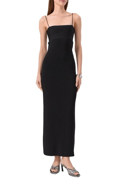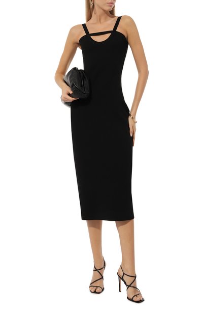 Для пошива приталенного мини-платья использовали вискозу с добавлением полиамида и шелка. Эластичный лиф украсили сзади рельефным логотипом марки. Модель с вырезом на спинке дополнили тонкими бретелями.