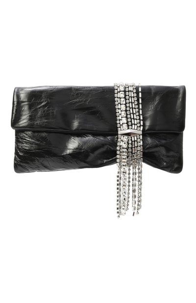 Клатч Zandra с внутренним накладным карманом выполнили из блестящей кожи с эффектом кракелюра. Аксессуар закрывается откидным клапаном с кристаллическими цепочками и фирменной серебристой пряжкой Diamond.