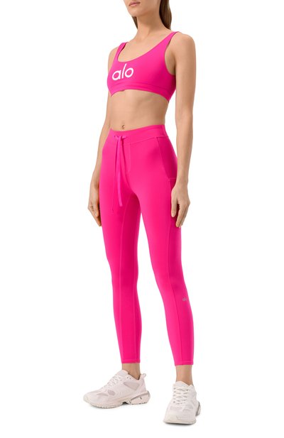 Легинсы с широким поясом выполнили из лайкры с добавлением эластана. Модель со средней посадкой украсили брендированными лампасами.