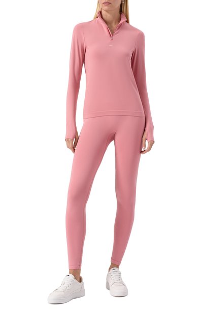 Легинсы с широким поясом выполнили из лайкры с добавлением эластана. Модель со средней посадкой украсили брендированными лампасами.