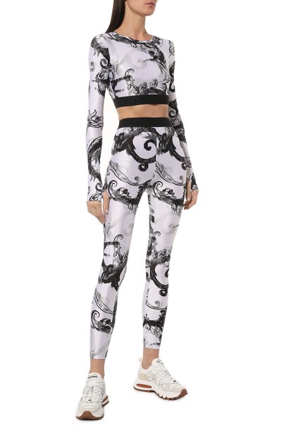 Легинсы с высокой посадкой сшили из эластичного полиэстера с принтом Barocco. Модель дополнили широким поясом-резинкой с жаккардовыми логотипами марки.