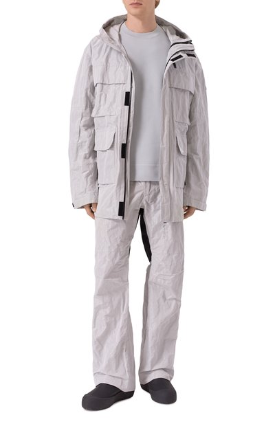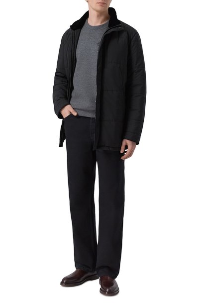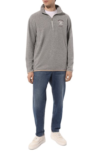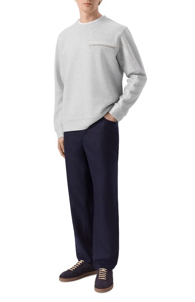 Для создания свитшота с V-образным вырезом использовали трикотаж на основе шерсти и кашемира. Один из рукавов дополнили карманом на молнии, отделанным гладкой кожей.