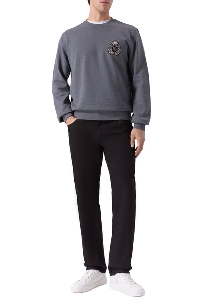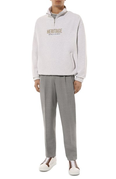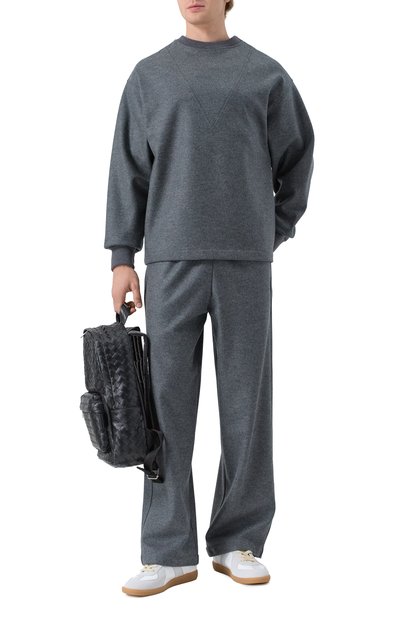 Для создания свитшота с V-образным вырезом использовали трикотаж на основе шерсти и кашемира. Один из рукавов дополнили карманом на молнии, отделанным гладкой кожей.