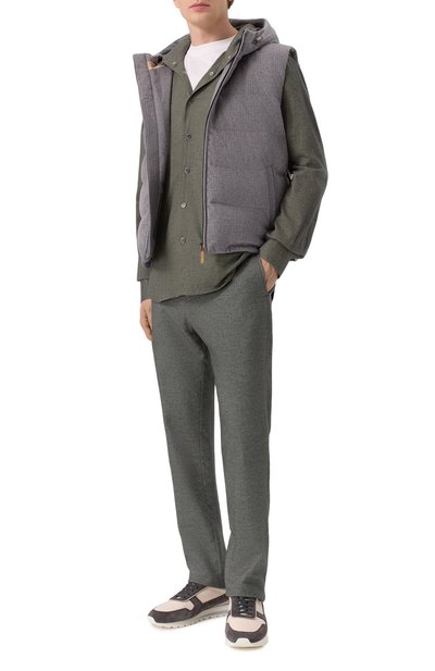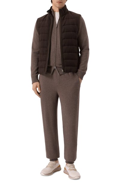 Брюки выполнили из baby-кашемира, вычесанного вручную у козлят редкой породы Hircus Bottus Laniger. Модель с эластичным поясом-кулиской в рубчик и боковыми карманами может стать основой комфортного образа.