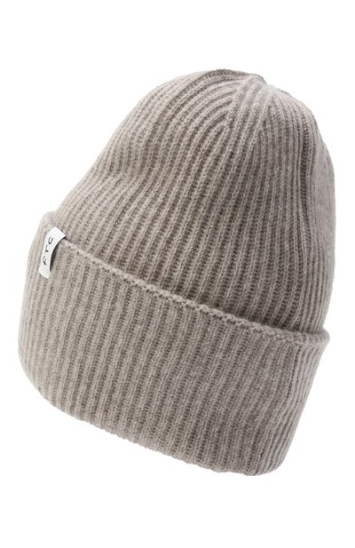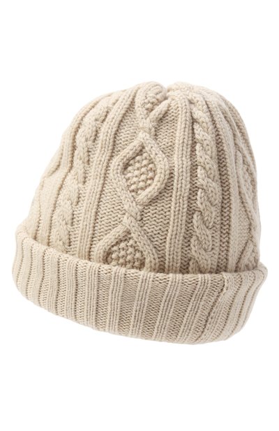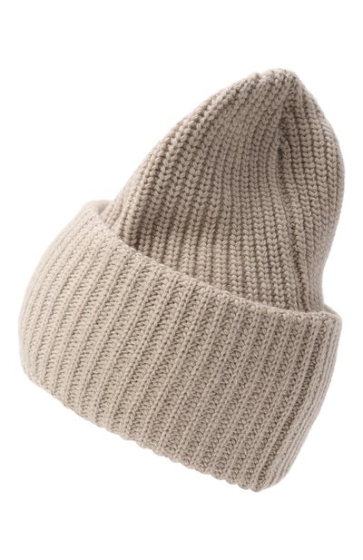 Шапку бини с широким отворотом связали резинкой из чистого кашемира. О принадлежности аксессуара марке говорит узкая репсовая лента с брендированной пластиной.
