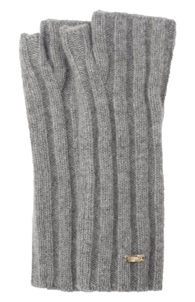 Для изготовления митенок с фактурным узором в широкую полоску использовали пряжу из чистого кашемира. Аксессуар декорировали на манжете золотистой пластиной с выгравированным логотипом марки.