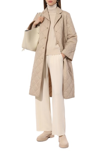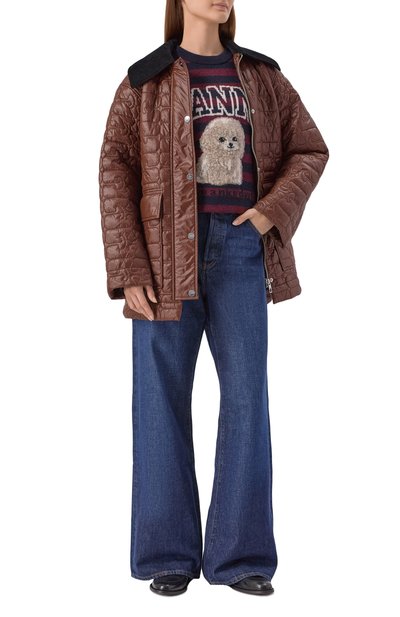 Стеганую куртку на гусином пуху выполнили из нейлона Chamonix с водоотталкивающей технологией Polartech. Модель с вельветовым отложным воротником, тремя карманами и патами на рукавах украсили фирменной накладкой на спинке.