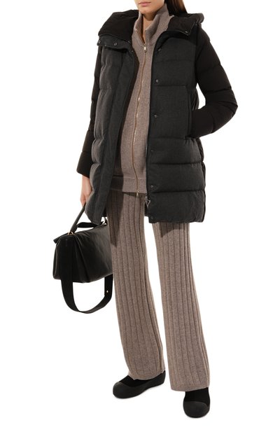 Пуховик с манжетами-митенками сшили из шерстяного твила с добавл ением полиамида и металлизированных нитей. Регулируемый капюшон декорировали брендированной нашивкой, а по бокам предусмотрели врезные карманы. Модель на гусиных пуху и пере застегивается встречной молнией.
