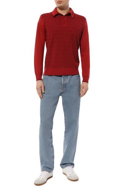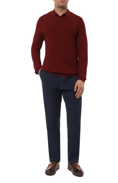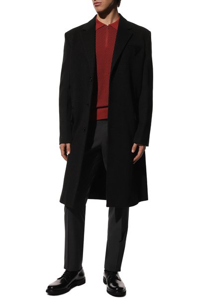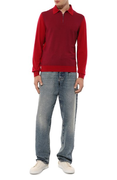 Поло из микса шерсти, шелка и кашемира украсили фактурным узором спереди. Модель с эластичными манжетами и поясом застегивается молнией с пуллером в форме знакового октагона.