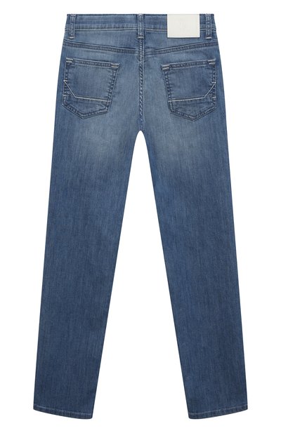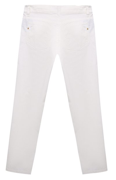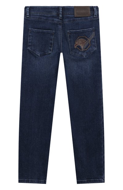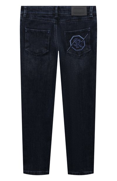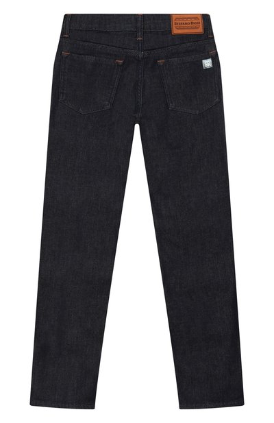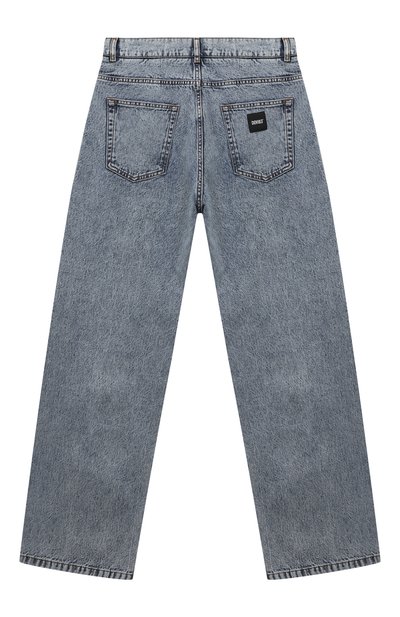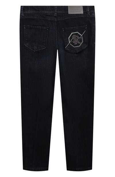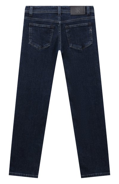 Джинсы с декоративными потертостями выполнили из хлопкового денима с добавлением полиэстера, вискозы и эластана. Один из пяти карманов модели украсили фирменной монограммой SR, а пояс изделия сзади дополнили брендированным патчем.