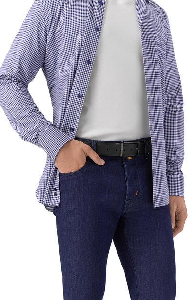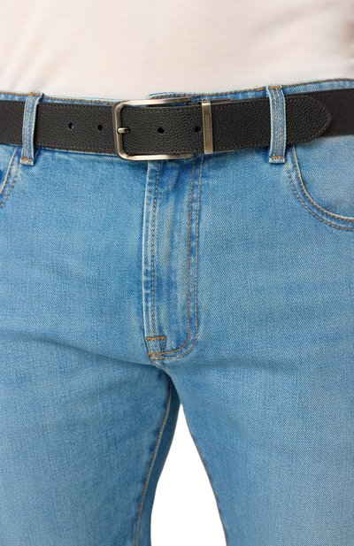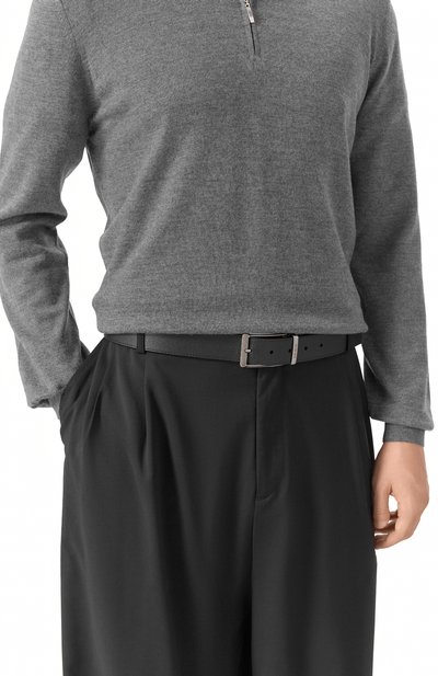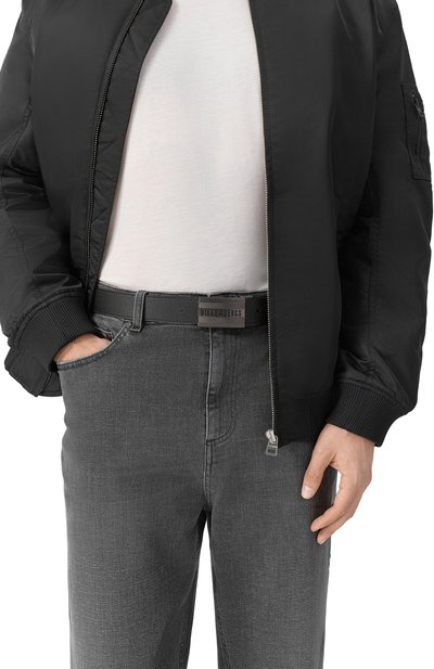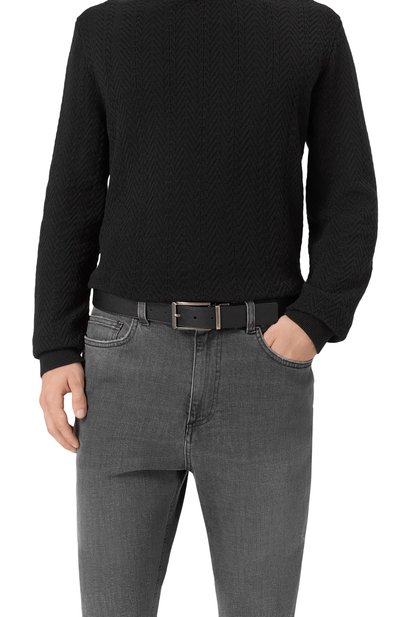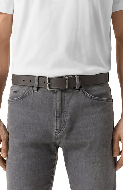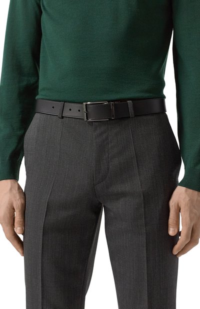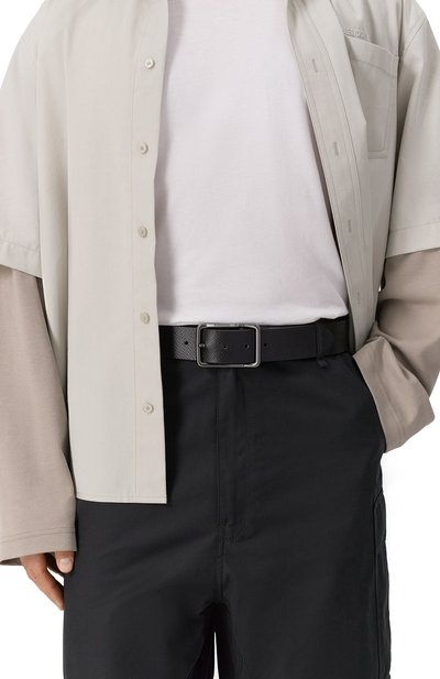 Для изготовления ремня стандартной ширины использовали зернистую кожу. Аксессуар застегивается прямоугольной пряжкой с выгравированным логотипом на интегрированном тренчике.