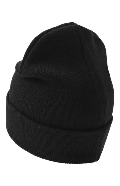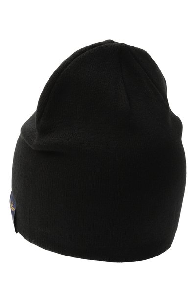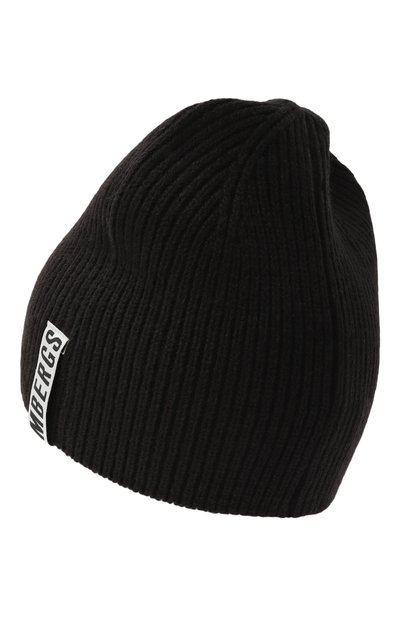 Для создания шапки бини с рельефными узорами использовали микс акрила и шерсти. Широкий отворот головного убора украсили нашивкой с логотипом бренда.