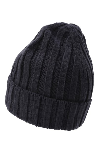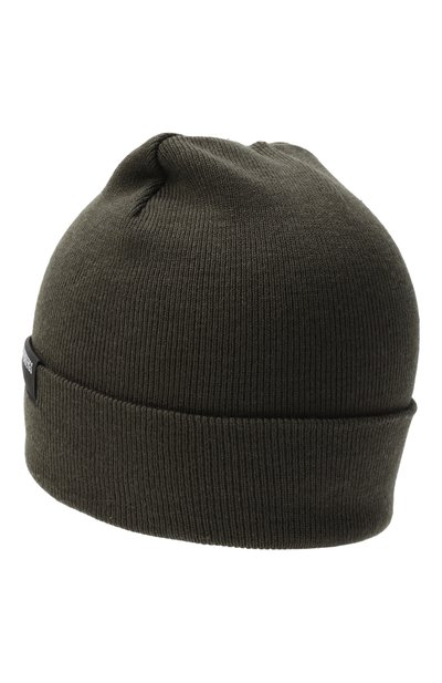 Шапку бини с рельефными узорами связали из акриловой пряжи с добавлением шерсти. Однотонный аксессуар с широким отворотом украсили брендированным патчем.