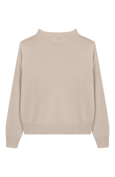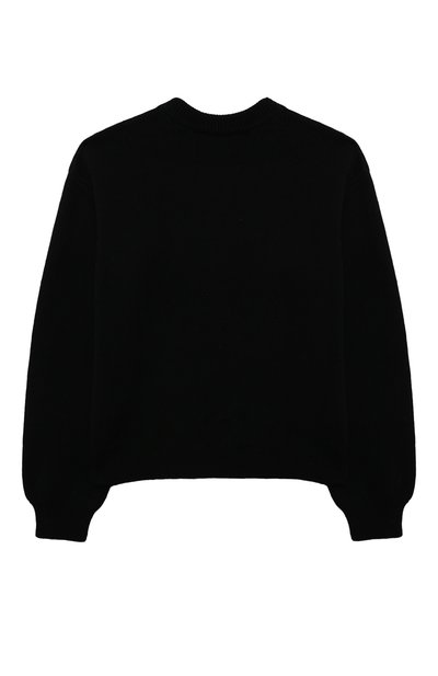Свитер с контрастными полосами на манжетах-оборках выполнили эластичной вязкой из микса шерсти и хлопка. Спереди модель с боковым разрезом на горловине украсили бантом и логотипом.