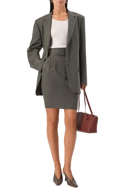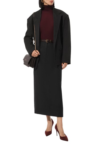 Макси-юбку с высокой посадкой выполнили из шерстяной ткани. Планка с брендированными пуговицами по всей длине спереди позволит сформировать и отрегулировать разрез.