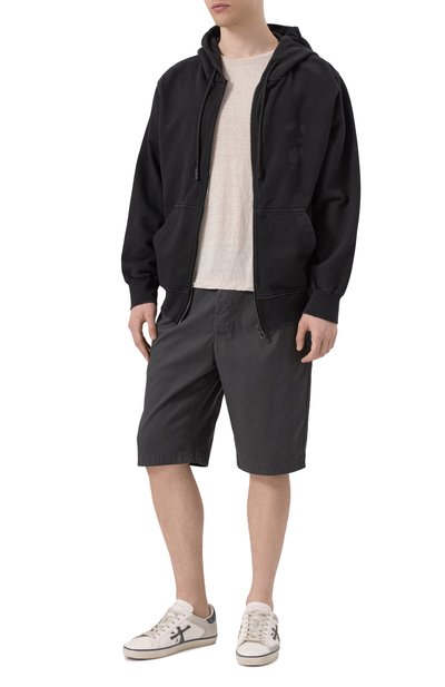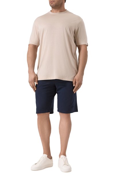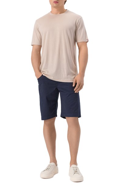 Футболку с круглой горловиной в рубчик выполнили из эластичного трикотажа на основе хлопка и тенсела. Сзади модель со спущенной линией плеч украсили нашивкой с миниатюрным кабошоном.