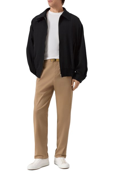 Брюки с двумя боковыми и парой задних карманов выполнили из слегка эластичного микса хлопка, шелка и тенсела. Посадку модели на талии можно отрегулировать встроенным в пояс ремнем с брендированной пряжкой.