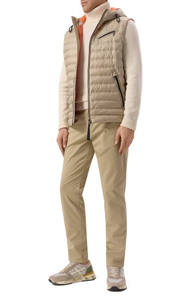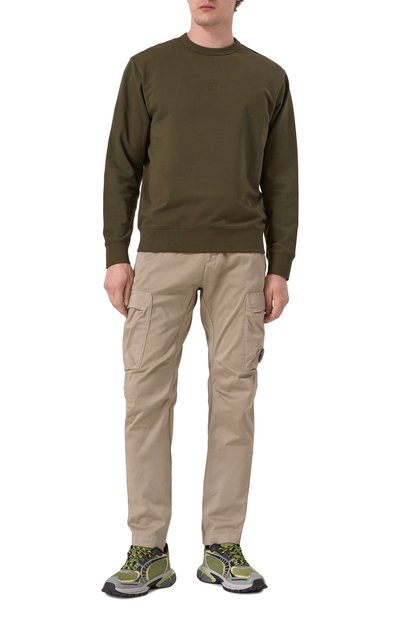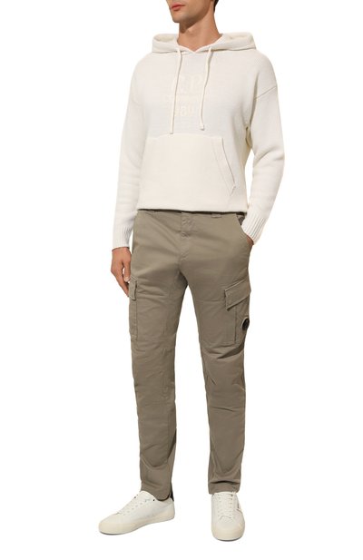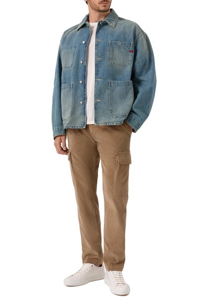 Брюки с фирменной лентой грогрен в эластичном поясе-кулиске сшили из хлопкового твила стрейч. Помимо боковых и задних карманов предусмотрели два крупных карго.