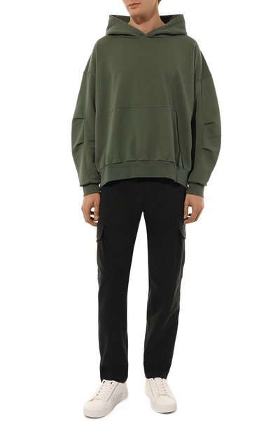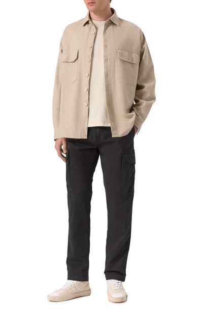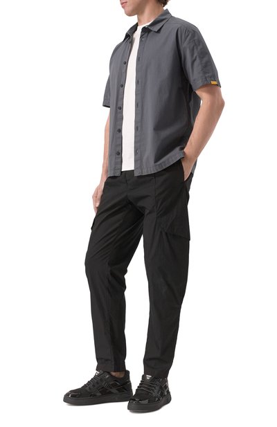 Брюки из хлопка с добавлением эластана дополнили тремя парами карманов: боковыми, задними и карго. Посадку модели на талии можно отрегулировать встроенным в пояс ремнем-лентой с пряжкой и фирменной фурнитурой.