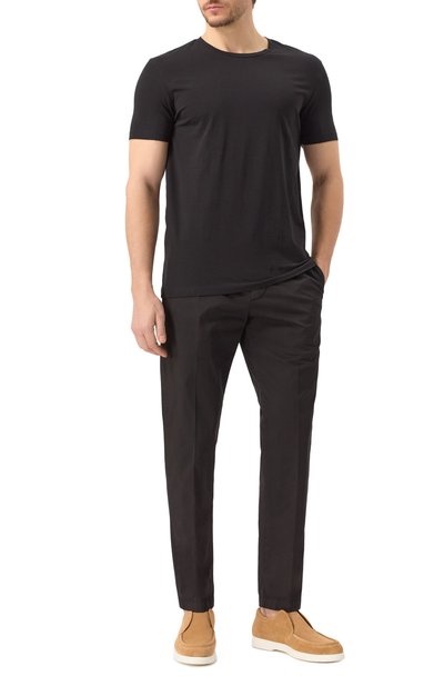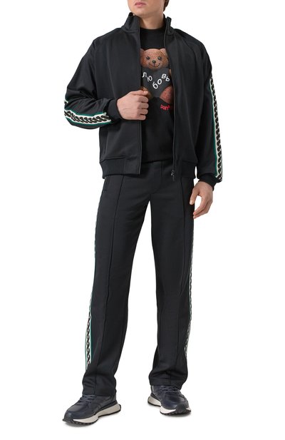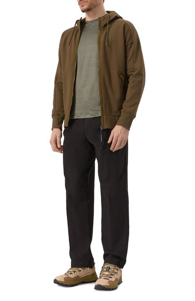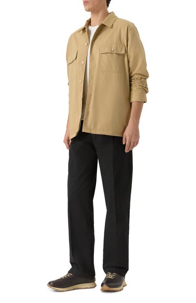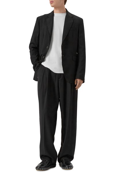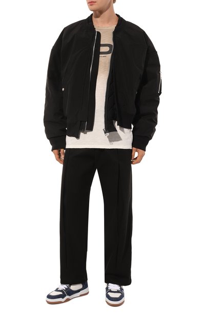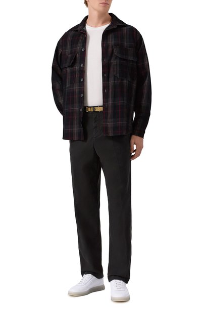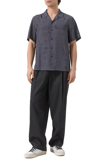 Брюки с защипами и поясом-кулиской, в который продели ремень, выполнили из стрейчевого твила на основе хлопка и нейлона. Рядом с одним из четырех карманов модели расположили фирменную заклепку с кабошоном.