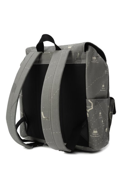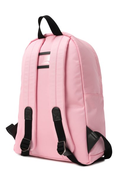 Рюкзак из текстиля с полиуретановым покрытием украсили повторяющимся логотипом марки. Переднюю панель декорировали фирменной двухслойной пластиной, а на контрастной спинке разместили слот для адресной карточки. Аксессуар, как и три наружных кармана, застегивается молнией.